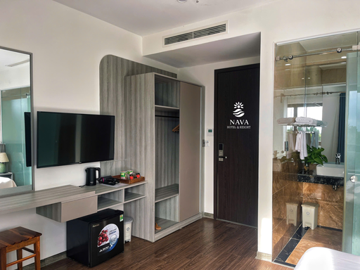 đứng, máy sấy tóc, TV. Phòng môt giường kích thước 1m8 x 2m.